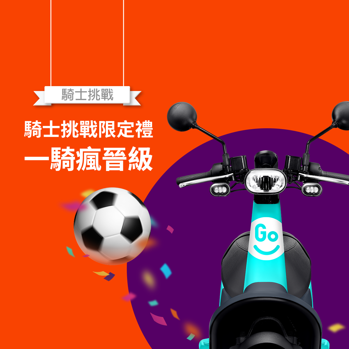 於活動期間內,完成「一騎瘋晉級」系列騎士挑戰,即可獲得 GoShare 騎乘金 $10 元 x 10 張 / $20 元 x 5 張。每組 GoShare 帳號限領一次。